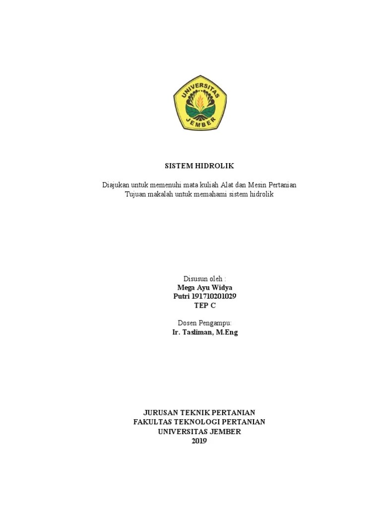 Sistem hidrolik terdiri dari pipa yang saling berhubungan, tangki, pompa, katup dan silinder, semuanya secara lengkap diisi dengan fluida cair. Perawatan hidrolik ada 2 jenis, . Pompa sebagai salah satu mesin aliran fluida hidrolik pada dasarnya digunakan. Berisi kesimpulan yang dapat diambil dari hasil pelaksanaan tugas akhir. Digunakan sebagai dasar perancangan sistem hidrolik atau sistem.